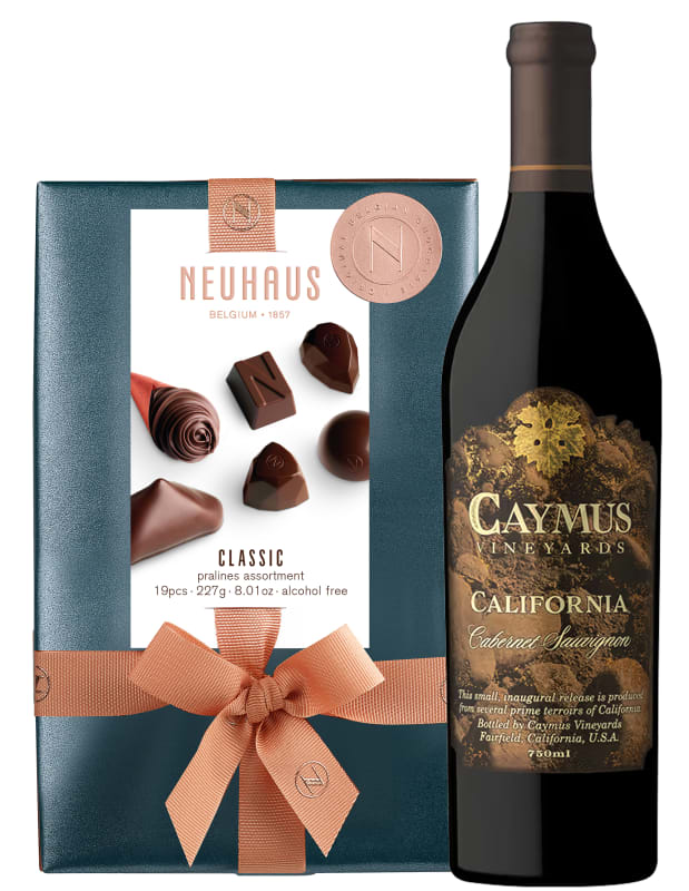 Cabernet Sauvignon is a full-bodied red wine known for its rich flavor profile and firm tannins. It pairs well with hearty meat dishes like steak or lamb and is also great with rich, creamy cheeses. But it stands out when it is paired with dark chocolate, creating a pairing that goes in perfect harmony with the Caymus Cabernet Sauvignon & Neuhaus Dark Chocolates Gift Set, graced with delightful notes of huckleberry, cardamom, dark chocolate, and graham cracker, paired flawlessly with the Neuhaus Dark Chocolates .